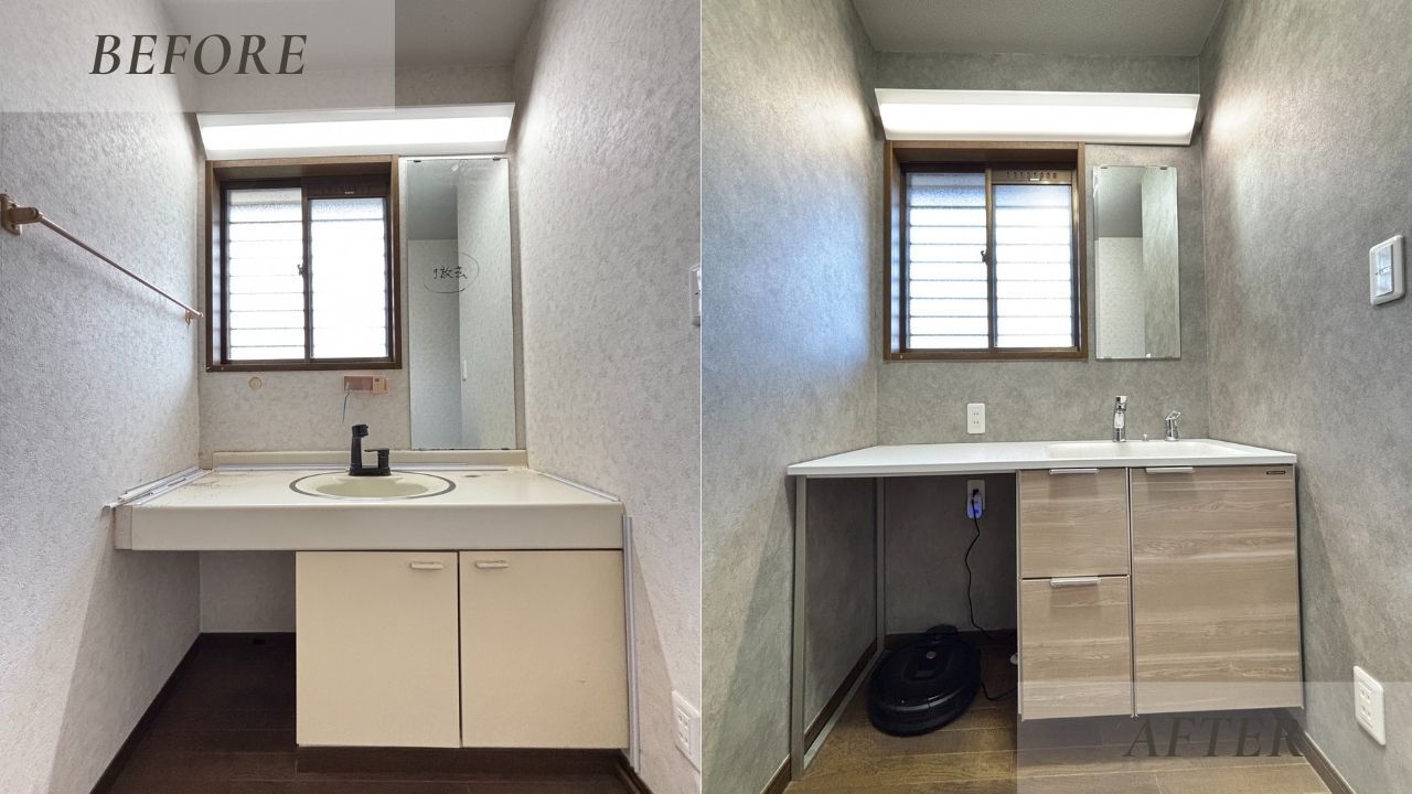 旧来の大きな蛇口とハンドルが、コンパクトになり鏡の下にスッキリ収まりました。収納はスライド式で見やすく、取り出しやすくなりました。